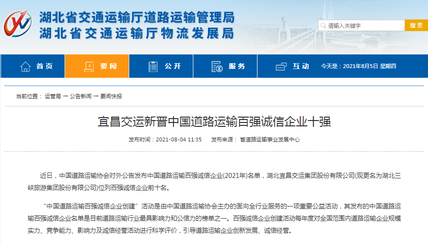 2021.08.18近日,中国道路运输协会对外公告发布中国道路运输百强诚信企业(2021年)名单,湖北宜昌交运集团股份有限公司(现更名为湖北三峡 【查看全文】